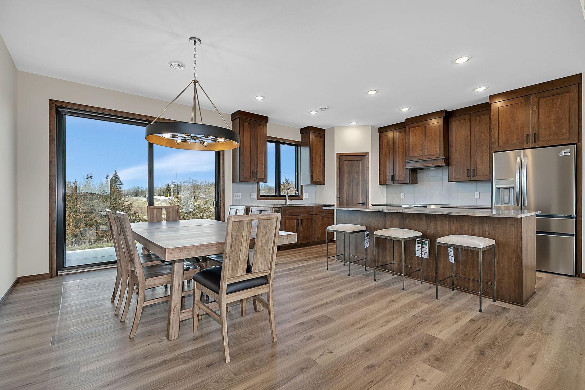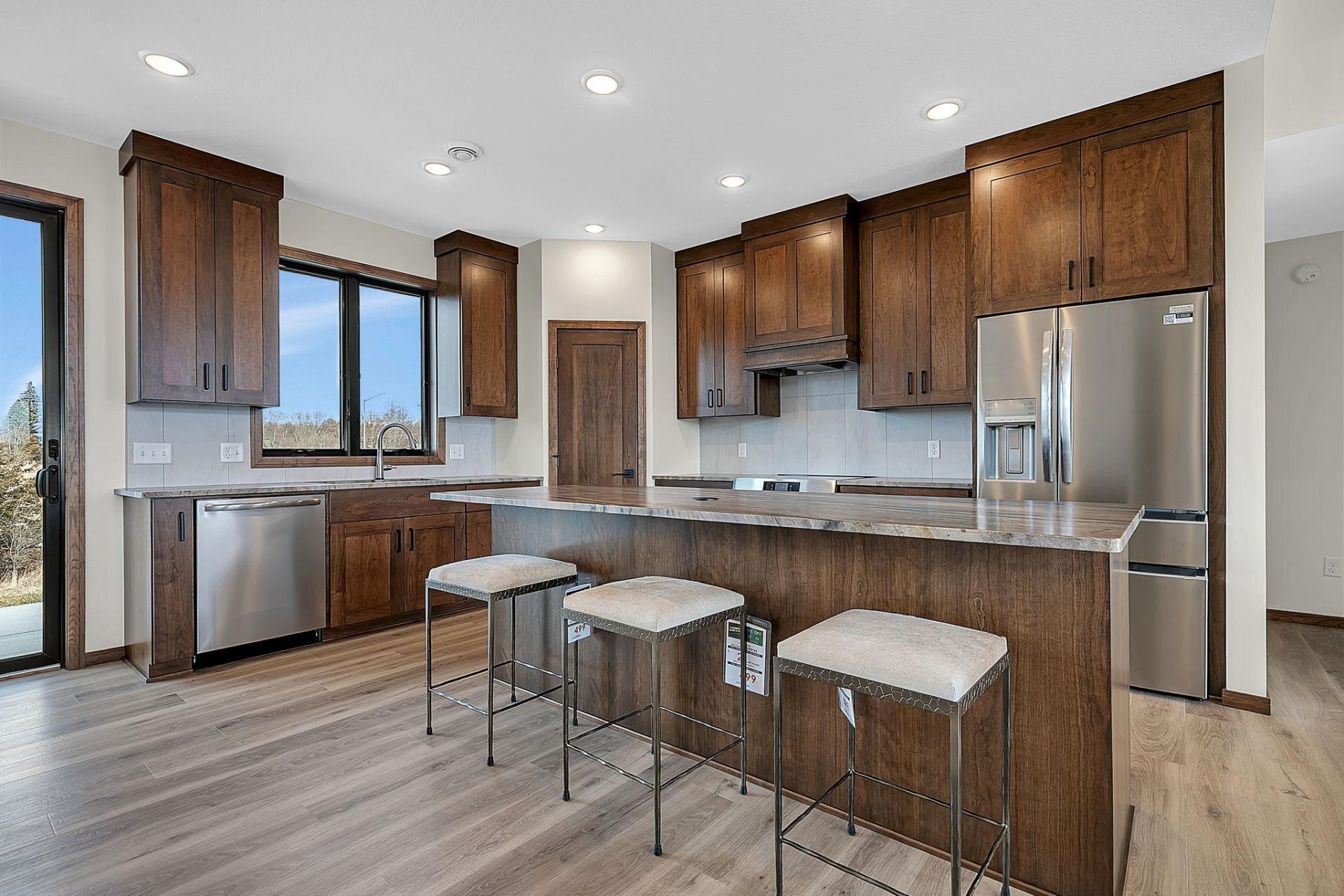 Enjoy easy one-level living in this bright and airy custom-built home featuring 3 bedrooms and 2 bathrooms, thoughtfully designed for everyday living and entertaining. The great room boasts over 10 ft high ceilings, large transom windows that fill the space with natural light, and a modern electric fireplace, and is open to the spacious dining area and a beautifully appointed kitchen with soft-close cherry cabinetry, natural quartzite countertops, and a walk-in pantry. The privately situated owner's suite offers a tray ceiling, generous walk-in closet, and a luxurious bath with dual quartz topped vanities and a walk-in tile shower. Two additional...read more